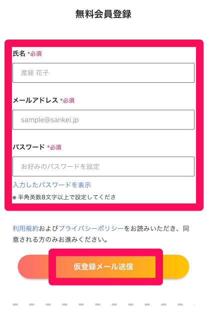 - 必要事項を入力して「仮登録メール送信」をタップして指示に従う