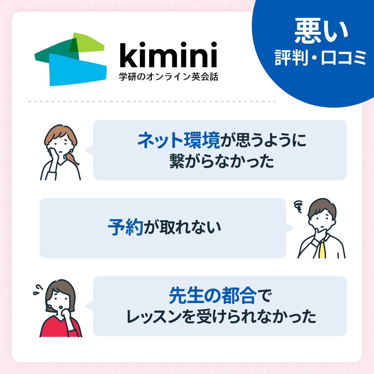 今までの内容を整理すると、kimini英会話の評判は以下の通りです。