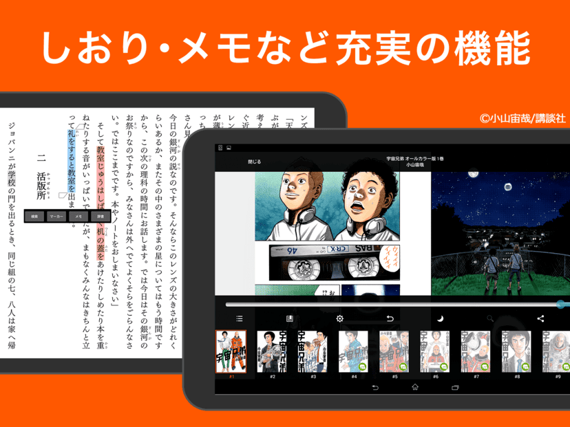 アプリでは、縦書き・横書きの切り替えやマーカー、辞書機能など、読書をサポートする機能が充実しています。