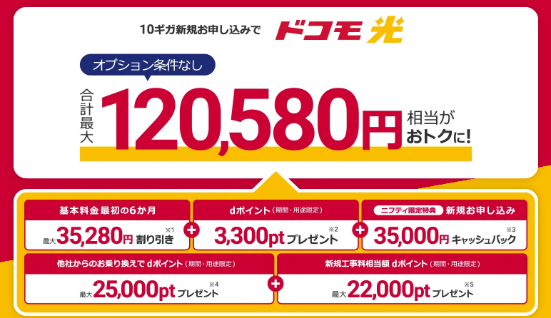 ドコモ光×@niftyでは、現在、戸建て・マンションどちらでも最大35,000円のキャッシュバックがもらえるお得なキャンペーンを実施中です。