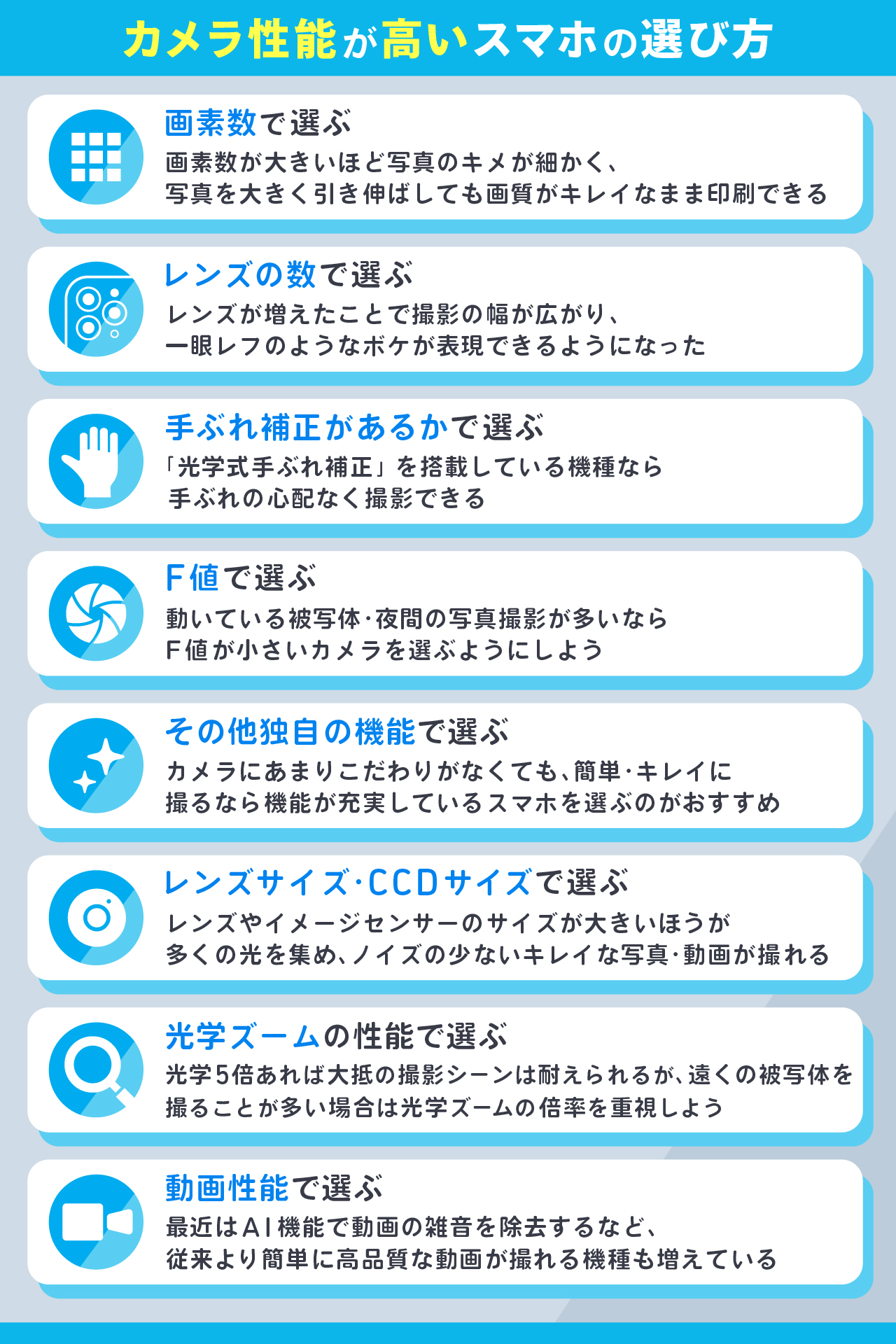 まず、カメラ性能が高いスマホを選ぶ際のポイントをみていきましょう。