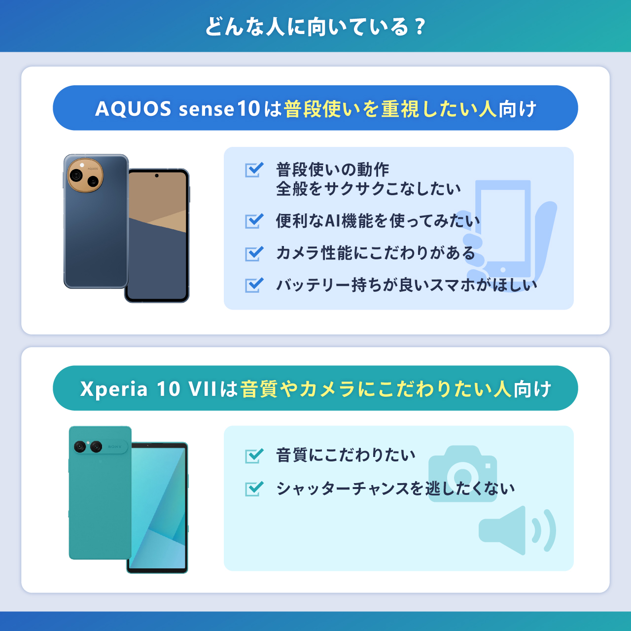 結論として、AQUOS sense10は性能重視な人、Xperia 10 VIIはエンタメを楽しみたい人に向いています。