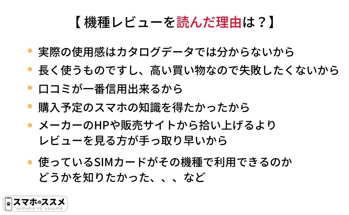 まずは、機種レビューを読んだ人の主な理由をまとめます。