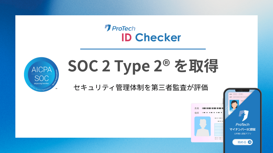 当社が提供する本人確認(tKYC)ツール「ProTech ID Checker」において、SOC 2 Type 2報告書を取得したことをお知らせします。これにより、当社サービスが厳格な管理体制のもと運用されていることが、第三者機関により確認されました。