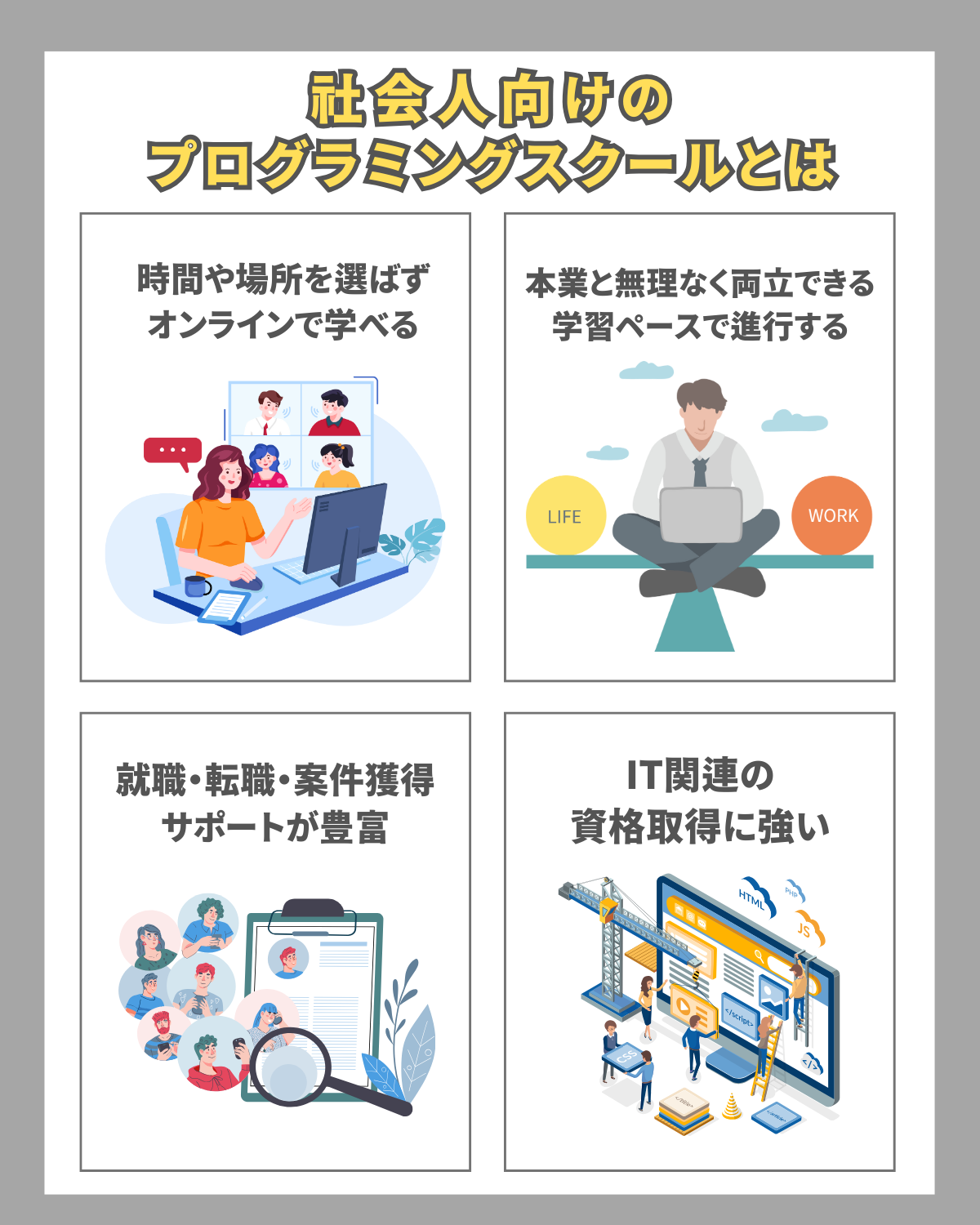 社会人向けプログラミングスクールの特徴は、下記の通りです。