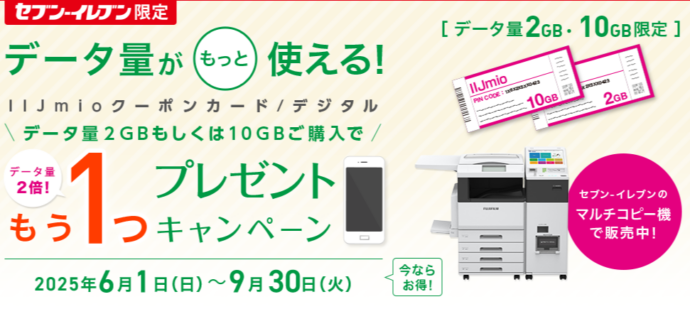 | セブン・イレブン限定 IIJmioクーポンカード/デジタルプレゼントキャンペーン | 2025年6月1日~2025年9月30日 | セブン・イレブンのマルチコピー機で2GB・10GBのIIJmioクーポンカード/デジタルを購入する | IIJmioクーポンカード/デジタルの2GB・10GBのデータ量が倍になる |