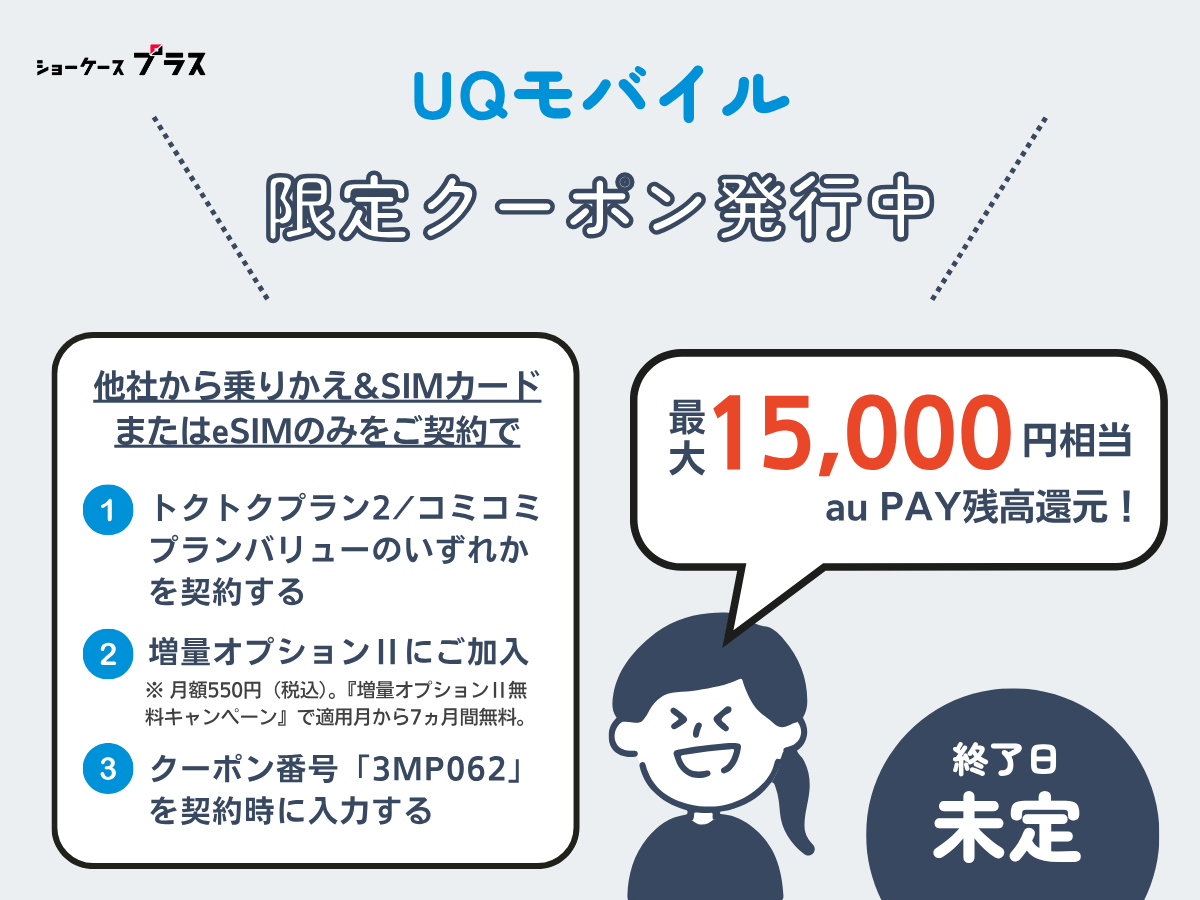 - 条件:UQ mobileオンラインショップでSIMのみ契約または対象端末を新規契約し、「コミコミプランバリュー」または「トクトクプラン2」に加入。加えて増量オプションⅡと家族セット割または自宅セット割のいずれかに申し込む必要あり
